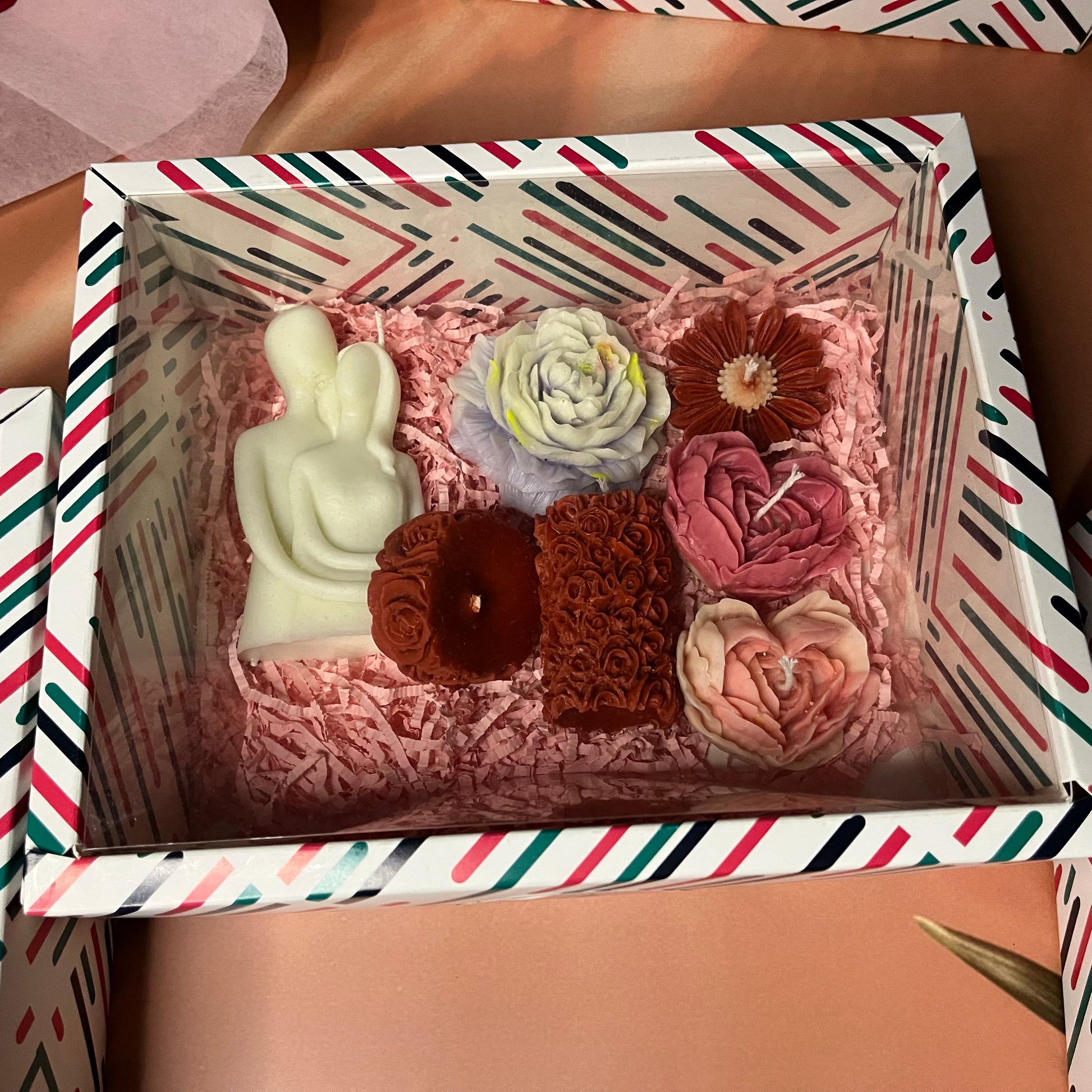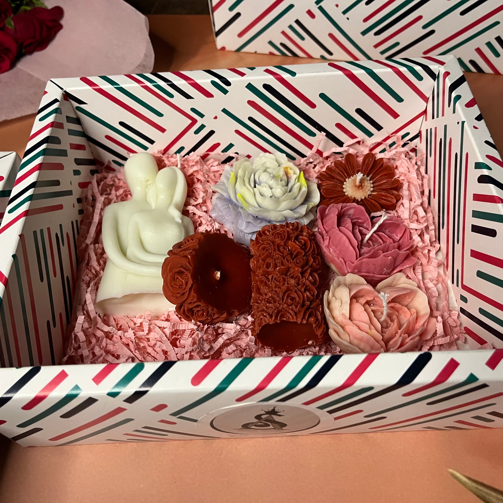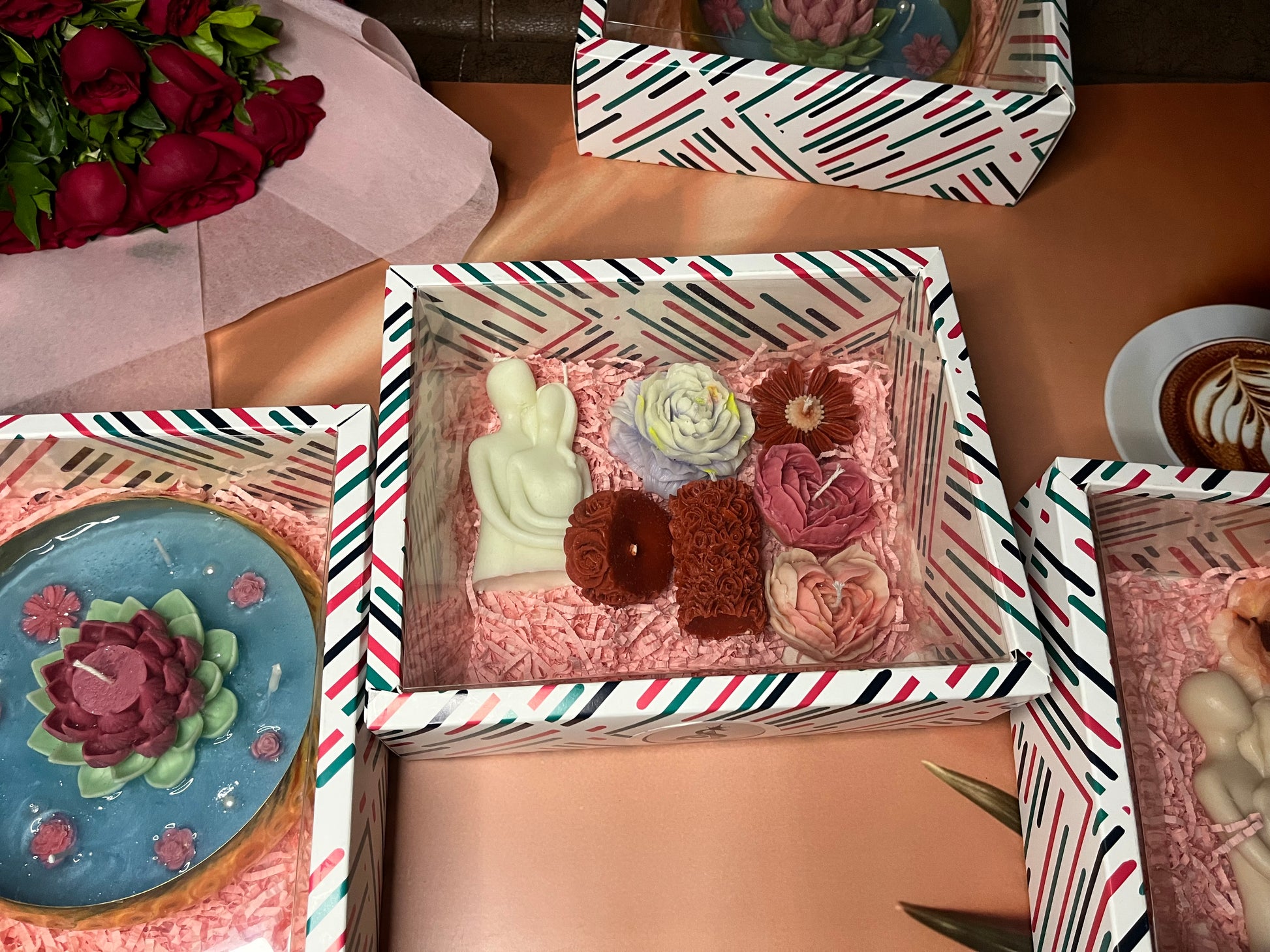 • Floral Scented Candles – delicately hand-poured in rose, peony, and daisy designs 🌸