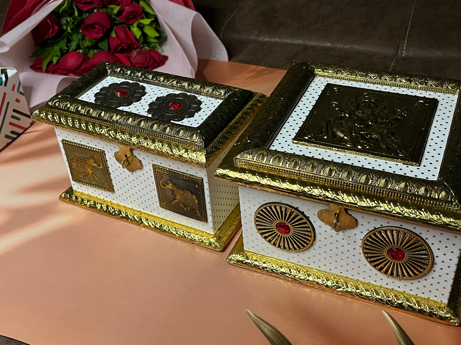 Elegance in a box β our Small Patty Hamper is the perfect gift for spreading light and fragrance this festive season. Packed in a royal golden patty box with intricate design and gem embellishments, it holds 2 luxury glass jar candles, hand-poured with love.